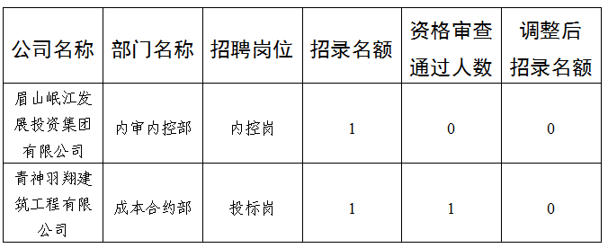 根据《眉山岷江发展投资集团有限公司2025年第二次公开招聘工作人员公告》规定:“开考比例(资格审查通过人数与招聘名额之比)将根据资格审查情况和岗位紧急程度等综合确定(至少形成竞争),对达不到开考比例的岗位,由岷江发展集团根据报名情况相应缩减或取消该岗位招聘计划”,现对《眉山岷江发展投资集团有限公司2025年第二次公开招聘工作人员的公告》中部分招聘岗位作相应调整,具体如下: