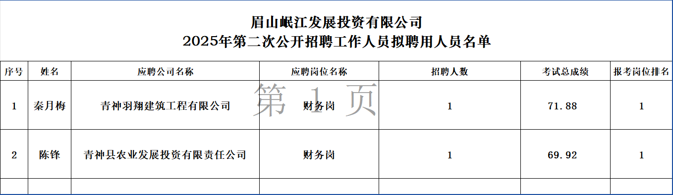 根据《眉山岷江发展投资有限公司2025年第二次公开招聘工作人员公告》的有关规定,经笔试、面试、体检、政审等程序,我公司确定秦月梅等2名同志为拟聘用人员,现予公示。