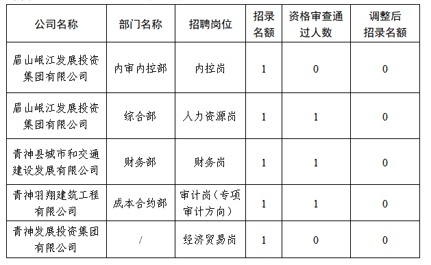 根据《眉山岷江发展投资集团有限公司2025年公开招聘工作人员公告》规定:“开考比例(资格审查通过人数与招聘名额之比)将根据资格审查情况和岗位紧急程度等综合确定(至少形成竞争),对达不到开考比例的岗位,由岷江发展集团根据报名情况相应缩减或取消该岗位招聘计划”,现对《眉山岷江发展投资集团有限公司2025年公开招聘工作人员的公告》中部分招聘岗位作相应调整,具体如下: