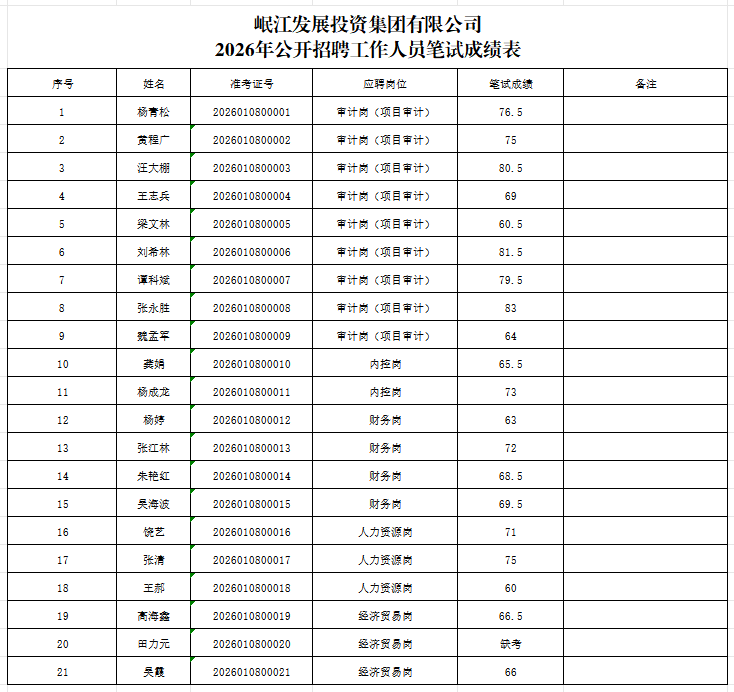 根据《眉山岷江发展投资集团有限公司2026年公开招聘工作人员公告》,现将眉山岷江发展投资集团有限公司2026年公开招聘工作人员笔试成绩予以公布。