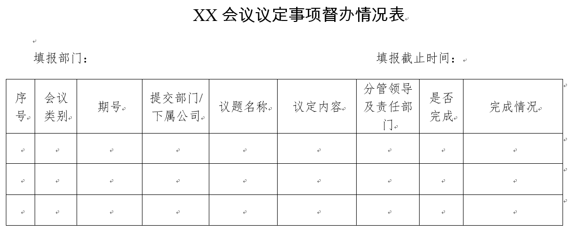 (一)党群工作部、行政管理部在各类会议纪要签发后2个工作日内,将会议议定事项通知或安排事项下发至相关部门、下属公司(以下统称承办单位),并明确反馈时限,各承办单位在规定时间内及时整理事项办理情况,报经单位负责人审核同意后(重大事项报分管领导审核同意),反馈至行政管理部。