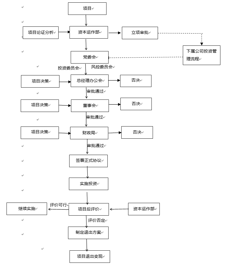 资本运作部将《项目建议书》《尽职调查报告》《可行性研究报告》以及合作协议等相关材料按流程提交集团公司总经理办公会、董事会、县政府、县委等投资管理决策机构进行审议。