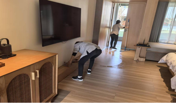 (图为汉阳院子酒店工作人员清扫客房现场)