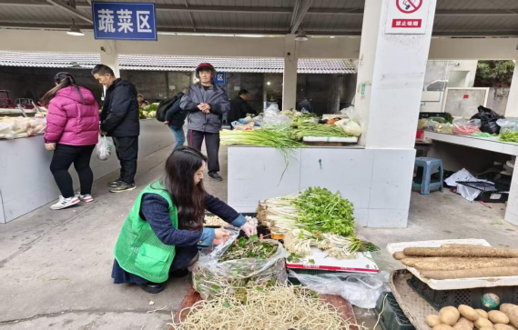 (图为农贸市场工作人员开展蔬菜现场监测现场)