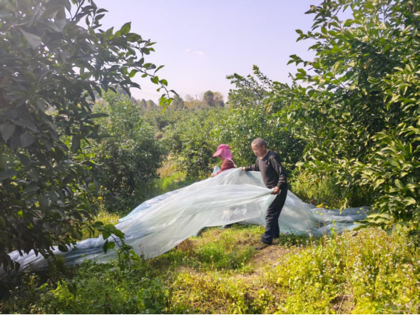 (图为农投公司果园开展防冻膜回收现场)