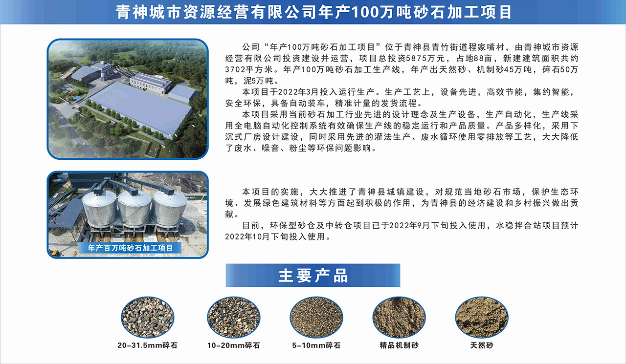 伴随着厂区内的阵阵轰鸣,青神城市资源公司年产百万吨砂石加工项目于3月1日正式投产。该公司由眉山市城市发展投资有限责任公司、青神发展投资集团有限公司出资成立,是市县国企融合发展的标杆企业之一。