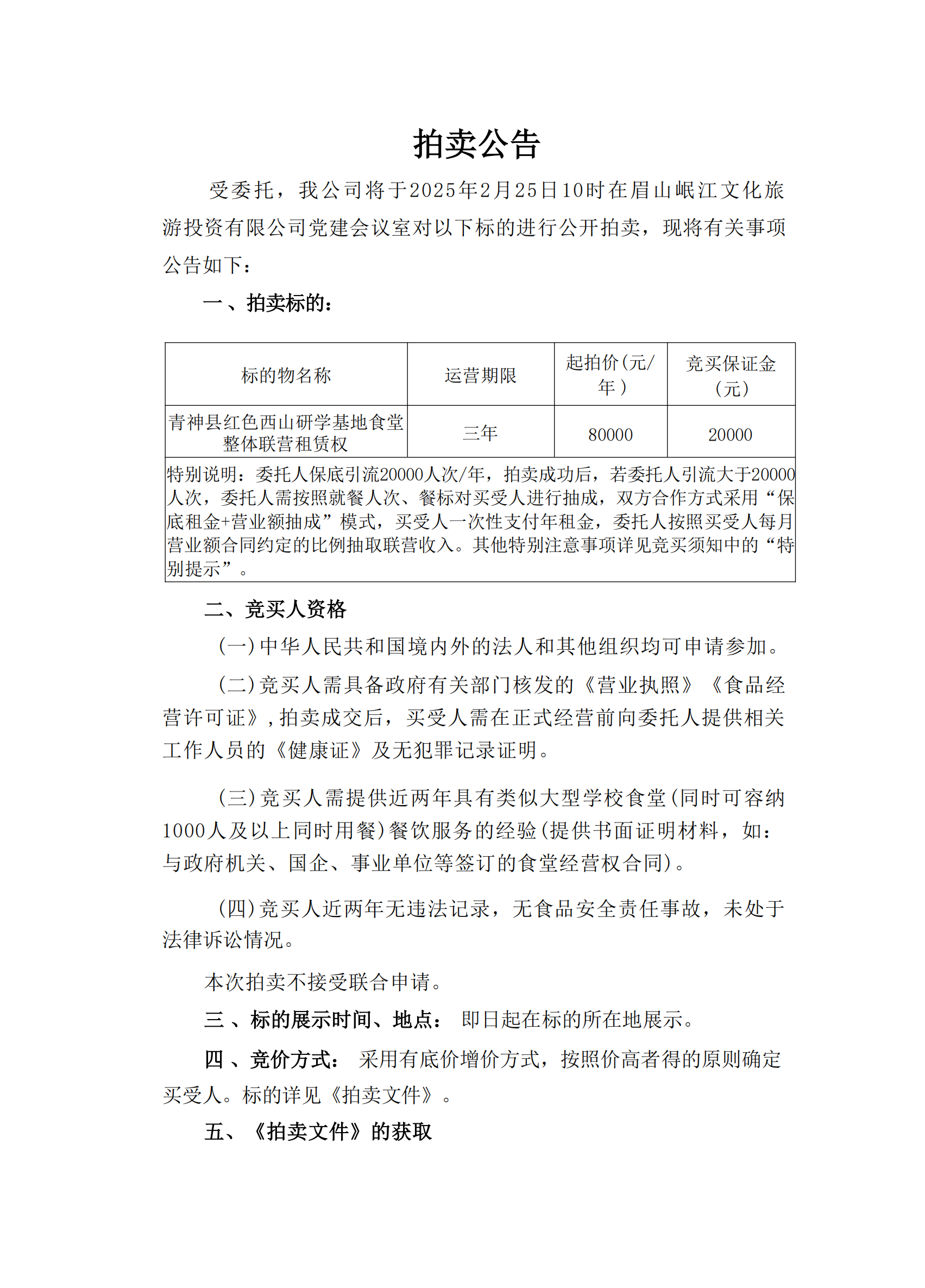 青神县红色西山研学基地食堂整体联营租赁权拍卖公告