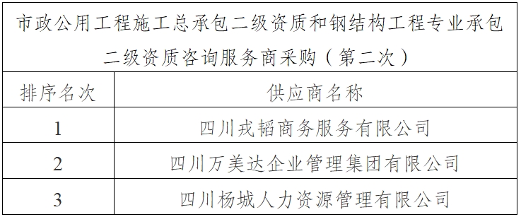 一、项目名称:市政公用工程施工总承包二级资质和钢结构工程专业承包二级资质咨询服务商采购(第二次)。